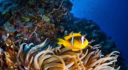 Because of the diversity of life found in the habitats created by corals, reefs are often called the rainforests of the sea. Fishes and other organisms shelter, find foo reproduce, and rear their young in the many nooks and crannies formed by corals. Certain parks also restrict fishing to maintain healthy populations of reef fish. In addition to protecting corals, parks also restore coral reefs by creating underwater nurseries for coral fragments to grow. These brilliantly-colored photos of coral reefs and the fish that live there include halfwater pictures that combine underwater and landscape into single images.