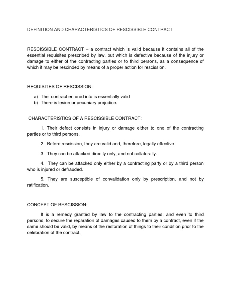 It may be set aside in whole or in part, to the extent of the damage caused. NCC) Which contracts are rescissible ? A rescissible contract is a contract which is valid because it contains all the essential requisites prescribed by law, but which is defective because of injury or damage to e. Binding force of rescissible contracts. RESCISSIBLE CONTRACTS. Therefore, if the injured party chooses not to question the defectiveness of the contract by filing an action for rescission, a rescissible contract can be enforced between the parties.